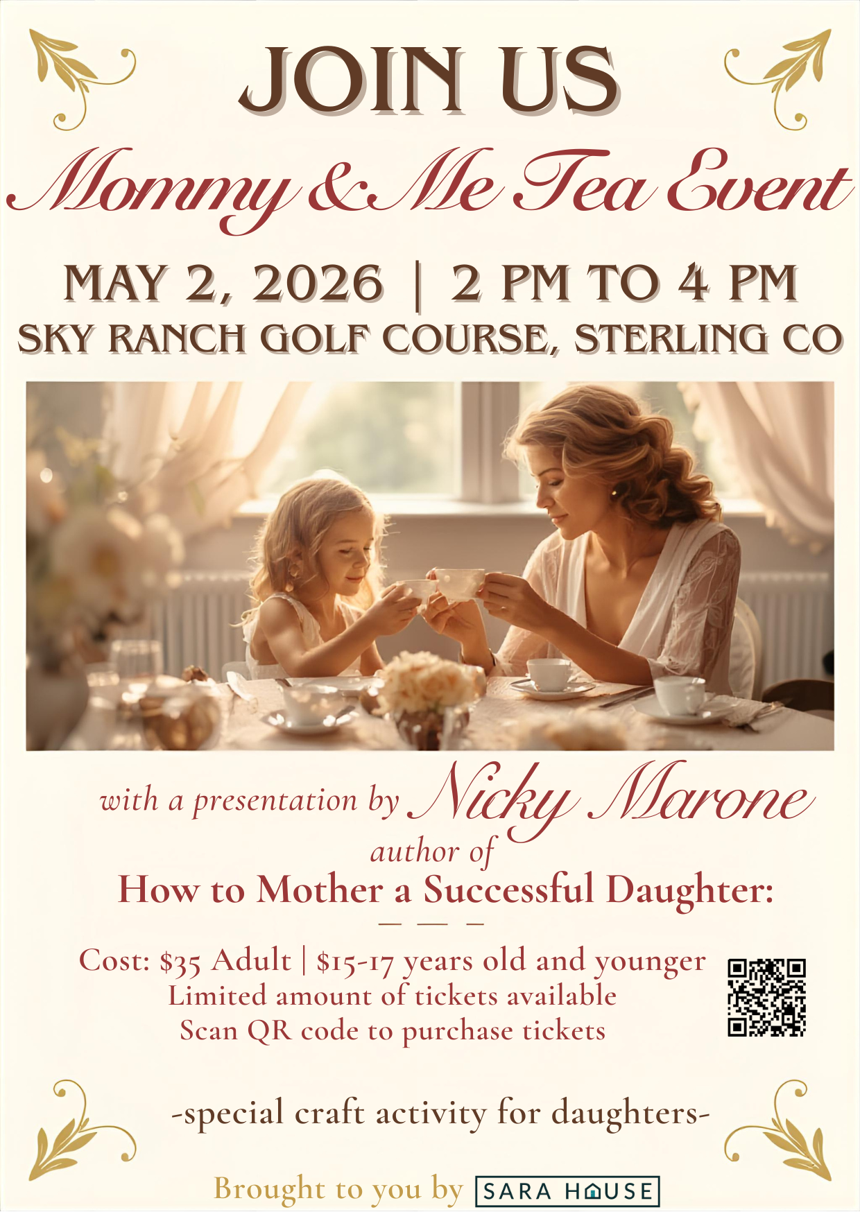 Celebrate the special bond between mothers and daughters at the Mommy and Me Tea, proudly hosted by SARA House. Set against the scenic backdrop of the Sky Ranch Golf Course in Sterling, Colorado, this elegant gathering will take place on Saturday, May 2nd, from 2:00 PM to 4:00 PM. Guests will enjoy a delightful afternoon featuring a selection of fine teas and a curated menu of dainty, tea-style party sandwiches and treats. The highlight of the event is an inspiring presentation by Nicky Marone, author of How to Raise a Successful Daughter, who will share her expert wisdom on empowering the next generation of women. It’s the perfect way to kick off the month of May with connection, community, and classic charm.